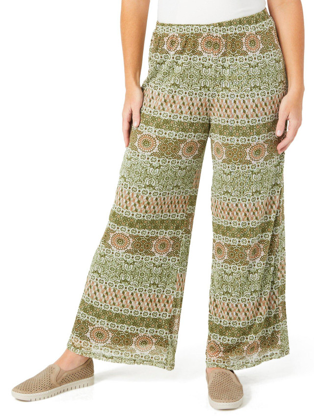 These petite pull on pants feature a soft, flowy material with a printed pattern that adds charm. The elastic waist offers a secure and comfortable fit. Inseam is approximately 28 in. Fabrication is 95% polyester and 5% spandex.