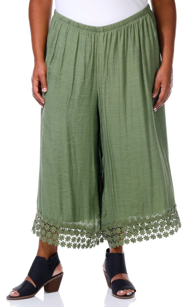 Stay stylish and comfortable in these Plus Solid Crochet Trim Flowy Pants. Featuring a breezy fit, soft inner lining, and an elastic waistband for all-day ease, these pants are finished with a delicate floral crochet hem for a touch of charm. Perfect for warm days or laid-back outings. Fabrication 62% rayon, 38% polyester