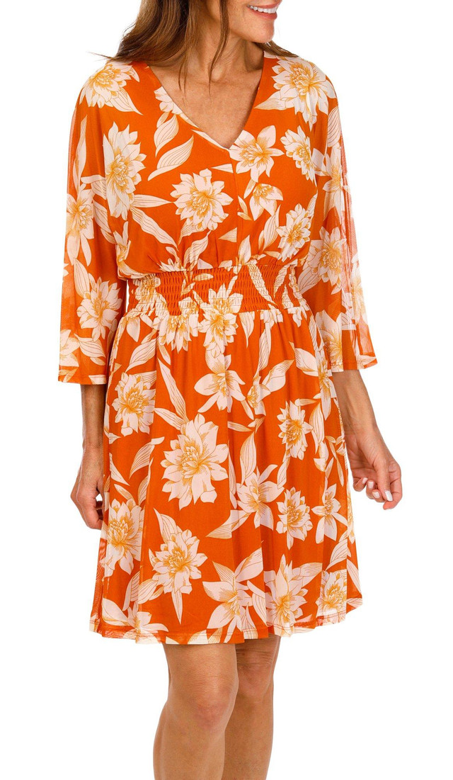 The Women's Mesh Smocked Waist Floral Dress features a flattering V-neckline and 3/4 length sleeves. Its smocked waist offers a comfortable fit, while the mesh overlay and floral design add a touch of elegance. Perfect for warm days or casual evenings out. Fabrication 95% polyester, 5% spandex