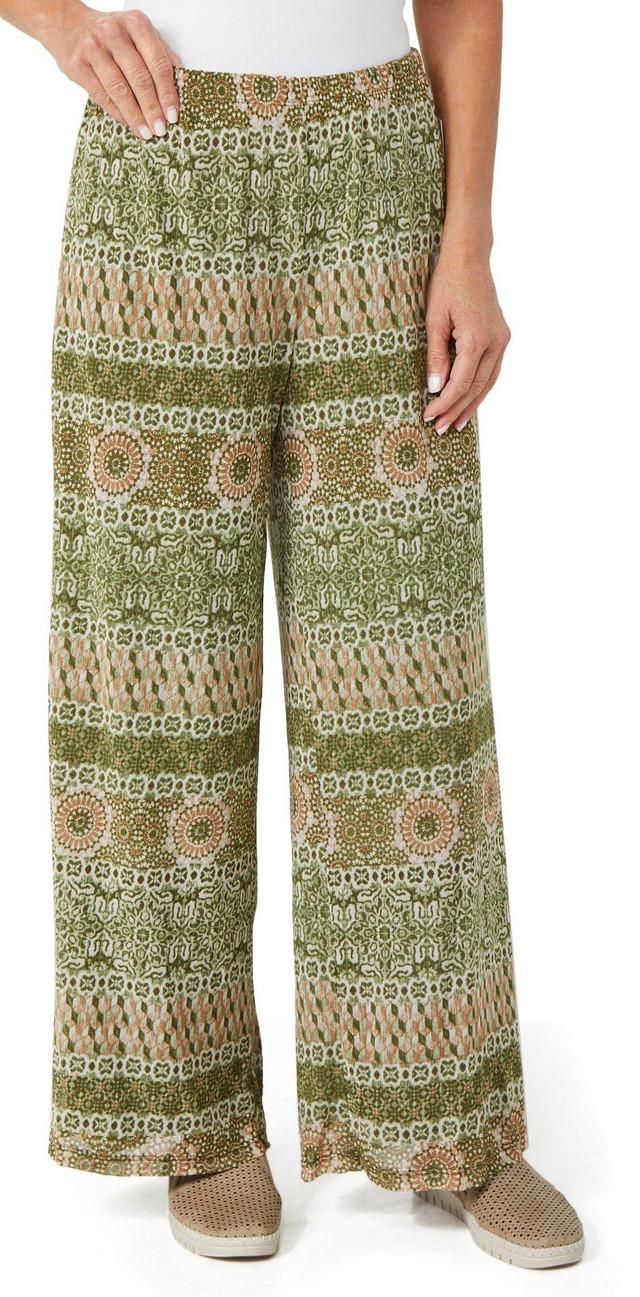 Our Womens Pull On Pants feature a soft, flowy material with a printed pattern that adds charm. The elastic waist offers a secure and comfortable fit. Fabrication is 95% polyester, 5% spandex