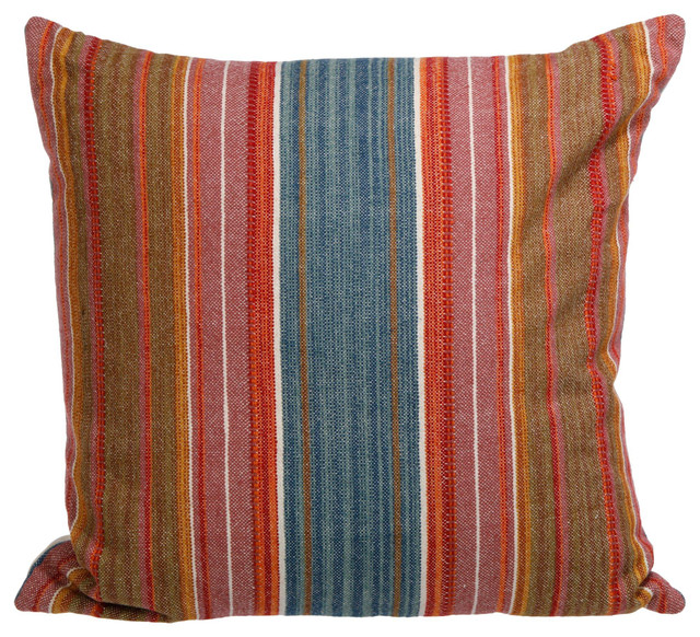 Add warmth and texture with the 20 in Striped Decorative Throw Pillow. Featuring rust, green, and gold stripes in varying widths on one side and a solid off white reverse, it offers versatile styling for any space. Ideal for layering on sofas or beds. Fabrication is 100% cotton (cover) and 100% polyester (fill). Measures approximately 20 in x 20 in.
