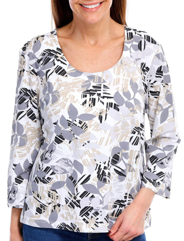 Introducing this stylish Petite 3/4 Sleeve Top, featuring a vibrant print pattern that adds a pop of color to your wardrobe. This top is designed with a classic scoop neck, offering a flattering and comfortable fit. Perfect for both casual and dressy occasions, it pairs effortlessly with jeans, skirts, or trousers. Elevate your everyday look with this versatile and eye-catching piece, ideal for adding a touch of fun and sophistication to any outfit! Fabrication is 97% cotton, 3% spandex.