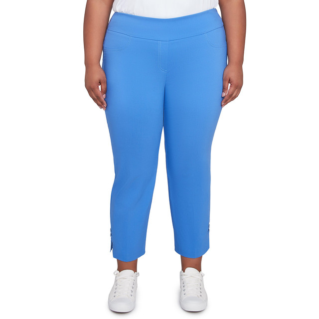 Look and feel your best in our Hearts of Palm Solid Tech Stretch Ankle Capris. Designed to flatter your figure and streamline your silhouette, they feature a solid color design on stretch knit fabric, faux pockets, a split hem with rivet detail, and pull-on styling. Length measures 27 in. Fabrication 78% rayon, 19% nylon, 3% spandex.