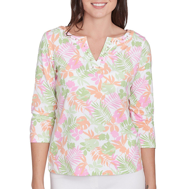This Women's 3/4 Sleeve Botanical Split Neck Top is made from a soft cotton blend, featuring a vibrant botanical print that brings a touch of nature to your wardrobe. The 3/4 sleeves offer a versatile fit, while the split neckline with embellishments adds a stylish flair. Perfect for both casual and semi-formal occasions, this top combines comfort and elegance seamlessly.