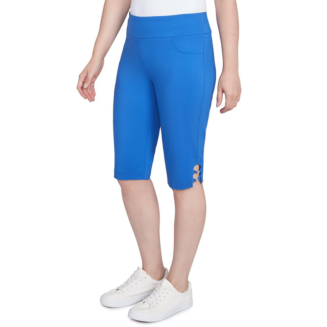 Hearts of Palm offers vibrant prints and embellished details. This pair of pull on crop pants features a bermuda styling, solid coloring, pull-on waistband, and fitted design.