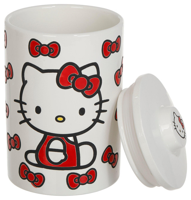 Keep your kitchen organized with this adorable Hello Kitty Canister with Bows. Perfect for storing snacks like cookies or candy or even snacks for the family pet. This jar features the classic Hello Kitty design that will make you smile every time you reach for it. The accompanying lid ensures freshness, while the sleek, modern look complements any kitchen decor. Measures approximately 8 in x 5 in.