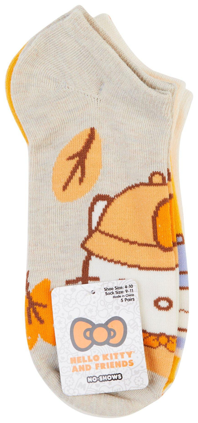 Add subtle seasonal style to everyday outfits with the 5 Pk Harvest No Show Socks. Featuring festive Hello Kitty harvest designs, each pair offers a low profile fit with soft comfort and playful charm. Ideal for wearing with sneakers during autumn activities. Fabrication is 98% polyester, 2% spandex. Sock size 9-11, Shoe size 4-10.