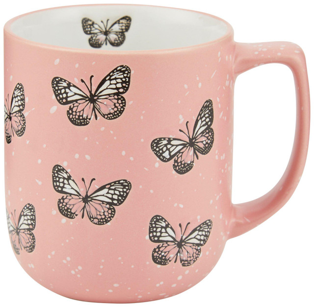 Savor your favorite hot or cold beverages with ease using this 16 Oz Butterflies on Pink Speckled Mug. Featuring a charming butterfly pattern, this ceramic mug adds a playful yet stylish touch to your drinkware collection. Its sturdy handle offers a comfortable grip, making it ideal for everyday use at home or the office. Perfect for coffee, tea, or iced drinks, this mug combines function with cheerful design. Mug cup itself holds 16 oz and measures approximately 4.5 in x 3.5 in.