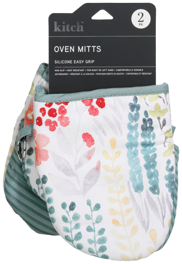 Protect your hands in style with this 2-pack of Small Oven Mitts, made from 100% cotton for comfort and durability. Heat-resistant and non-slip, they provide a secure grip for handling hot pans and dishes. Designed to fit either hand, these compact mitts are perfect for everyday cooking and baking. A practical, stylish addition to any kitchen. Fabrication is 100% cotton (fabric), 100% silicone (grip). Measures approximately 7 in x 5.5 in.