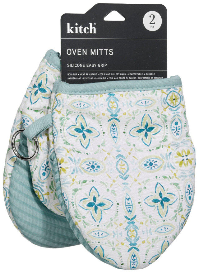 Protect your hands in style with this 2-pack of Small Oven Mitts, made from 100% cotton for comfort and durability. Heat-resistant and non-slip, they provide a secure grip for handling hot pans and dishes. Designed to fit either hand, these compact mitts are perfect for everyday cooking and baking. A practical, stylish addition to any kitchen. Fabrication is 100% cotton (fabric), 100% silicone (grip). Measures approximately 7 in x 5.5 in.