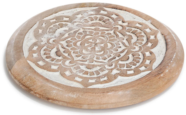 Protect surfaces in style with this carved flower wood trivet. Featuring an intricate floral design and natural wood finish, it adds a decorative touch while offering heat-resistant support for hot dishes and cookware. Measures 9 inches round.