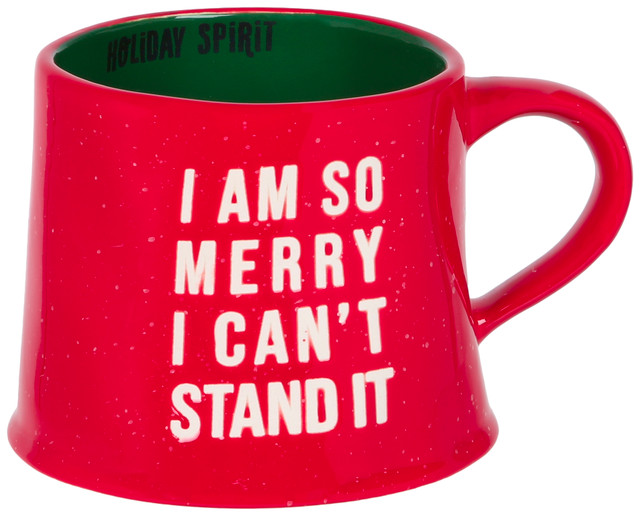 Add playful cheer to seasonal sipping with the Christmas I Am So Merry Red Coffee Mug featuring the phrase I Am So Merry I Can't Stand It on both sides over a red background with tan speckles. Finished with a green interior and Holiday Spirit text for added festive detail. Fabrication is 100% ceramic. Measures approximately 3.75 in x 4 in diameter.