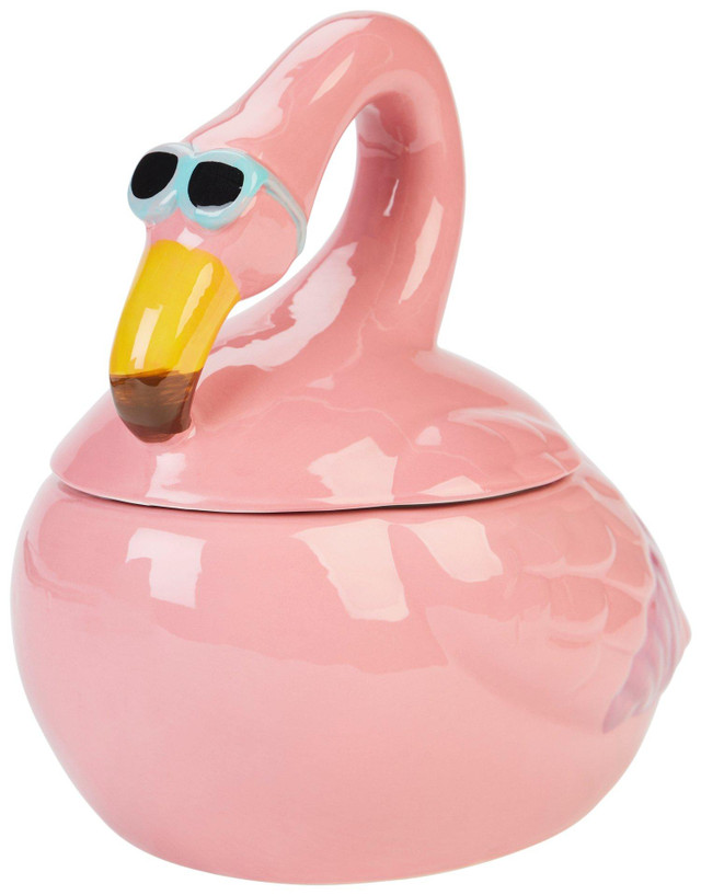 Add a fun tropical touch to your kitchen with this flamingo sunglasses cookie jar. It measures approximately 11.81 in x 9.06 in x 10.74 in, and offers plenty of space for your favorite treats. Made with durable materials, it is hand wash recommended but also dishwasher and microwave safe for added convenience. A playful and practical addition to any countertop.