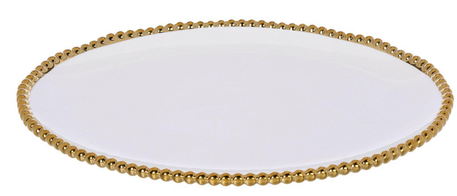This large oval serving tray features a refined gold finish on the edges, offering timeless elegance for any occasion. Crafted to be scratch resistant, tarnish free, and polish free, this tray provides lasting beauty with easy care. Perfect for presenting appetizers, desserts, or main dishes, this durable and stylish piece enhances both everyday meals and special gatherings. Measures approximately 15 in x 11.5 in.