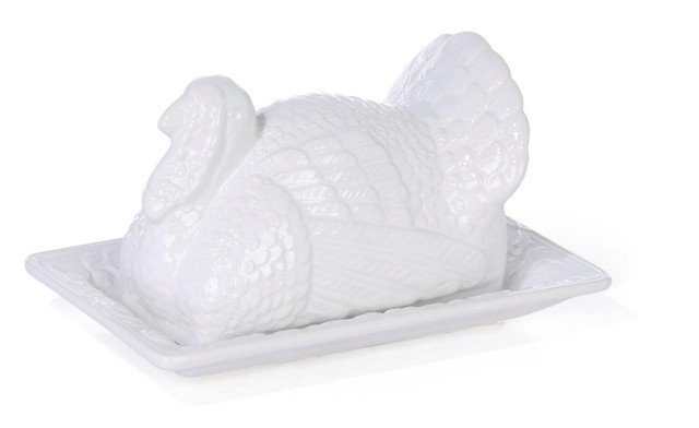 Bring seasonal charm to your table with this Harvest Turkey Ceramic Butter Dish, featuring a two piece design with a classic white base and a cover shaped like a turkey. Crafted from ceramic for both festive style and everyday function. Dishwasher and microwave safe for added convenience. Measures approximately 8 in x 5 in x 5 in.