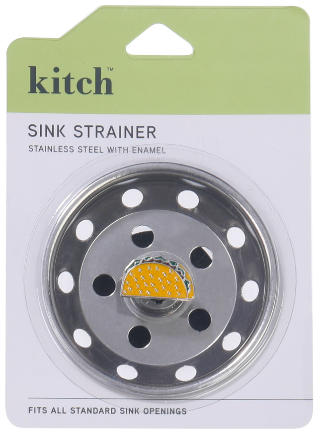Brighten your sink with the Kitch Taco Sink Strainer featuring a colorful taco enamel accent on a sturdy stainless steel frame. Designed to catch food and debris while adding a touch of personality to kitchen cleanup. Fits all standard sink openings. Hand wash only. Fabrication is stainless steel and enamel.