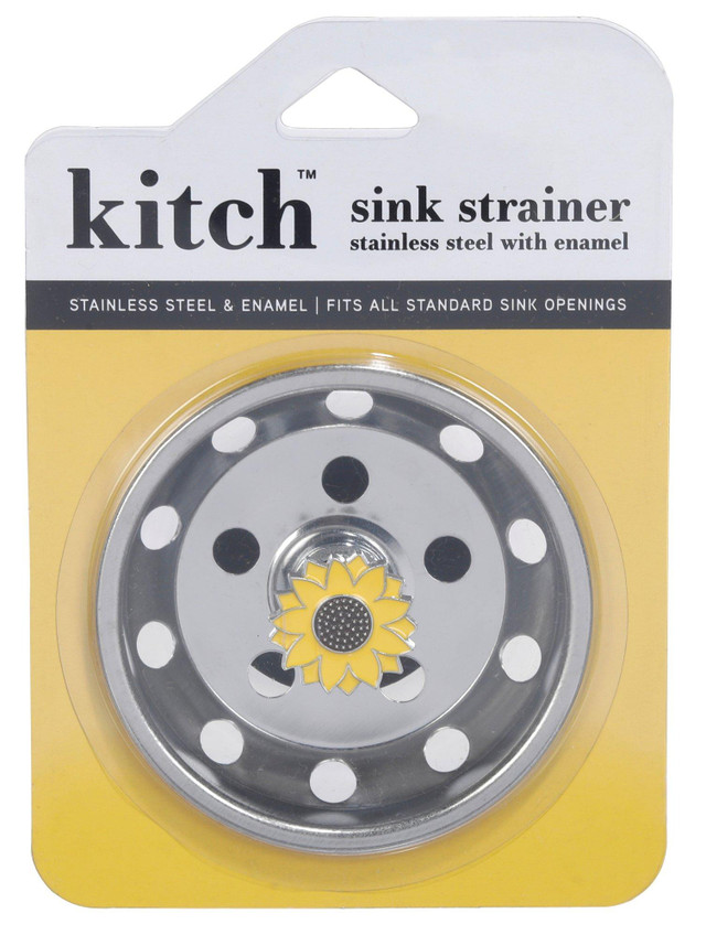 This stainless steel sink strainer features an enamel sunflower decoration that adds a bright, cheerful accent to the sink. Designed to trap food and other debris, this strainer helps keep drains clear while offering a durable and easy to clean solution with a touch of floral charm. Fits all standard sink openings.
