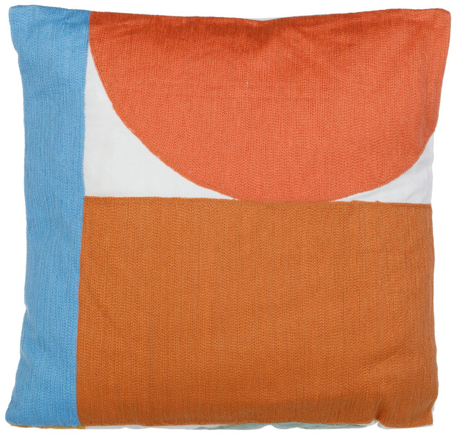 Add a bold, artistic touch to your space with this modern geometric pillow. Featuring a striking burnt orange semi-circle on a crisp white background with a deep blue vertical stripe, this design channels mid-century modern style. Crafted from soft fabric with a hand-block print feel, its a vibrant accent for any room.