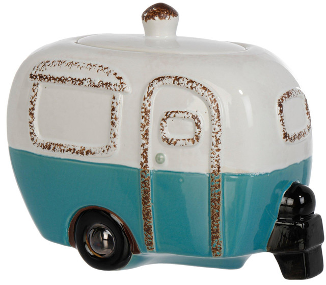 Add a touch of retro charm to your kitchen with this 10-inch Blue Camper Van Canister. Crafted from ceramic, it features a whimsical figural design and holds up to 132 fl oz. Perfect for storing treats or dry goods, it measures 10 in x 5 in x 8 in and brings a fun, nostalgic vibe to any space.