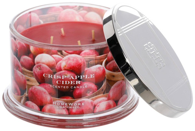 Fill your home with the scent of the season using this 18 oz Harvest Crisp Apple Cider Scented Candle, infused with essential oils and designed with four wicks for a strong, even burn. Fragrance notes include granny smith apple, juicy gala apple, spiced bourbon, clove, and nutmeg. Burns for 30 to 55 hours. Trim wicks before each use for best results. Measures approximately 3.5 in x 5.5 in round.