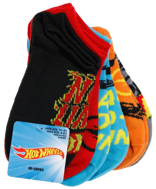 This 5-pack of boys' no-show socks features bold Hot Wheels logo and design details, perfect for young car enthusiasts. Sized to fit shoe sizes 7.53.5 and sock sizes 68.5, these socks offer a snug, comfortable fit with soft, stretchy fabric. Ideal for everyday wear, they stay hidden under shoes while adding a fun, action-packed touch to any outfit.