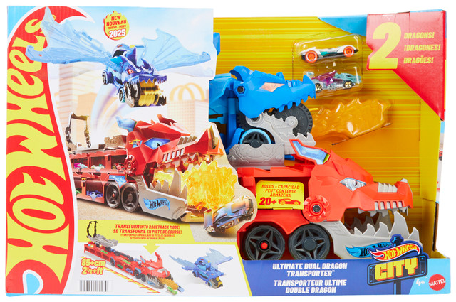 Unleash action packed fun with the Boys Ultimate Dual Dragon Car Transporter Toy, a fierce dual dragon hauler that drives, attacks, and transforms into a 2 1/2 foot racetrack. Featuring the Speed Snap Track System, it detaches for chomping car action, stores up to 20 vehicles, and includes 2 cars to get racing right out of the box. For ages 4 years and up.