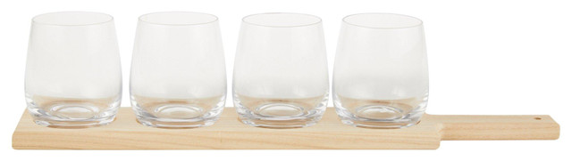 Explore your favorite wines with the 5 Piece Wine Flight Tasting Board. This set includes a wooden flight board measuring 18.5 inches long, 4 wine glasses 12 fl oz , and a 4-ring design to hold each glass securely in place. Perfect for tastings, entertaining, or gifting, it combines rustic style with practical function. Hand wash recommended for both board and glasses.