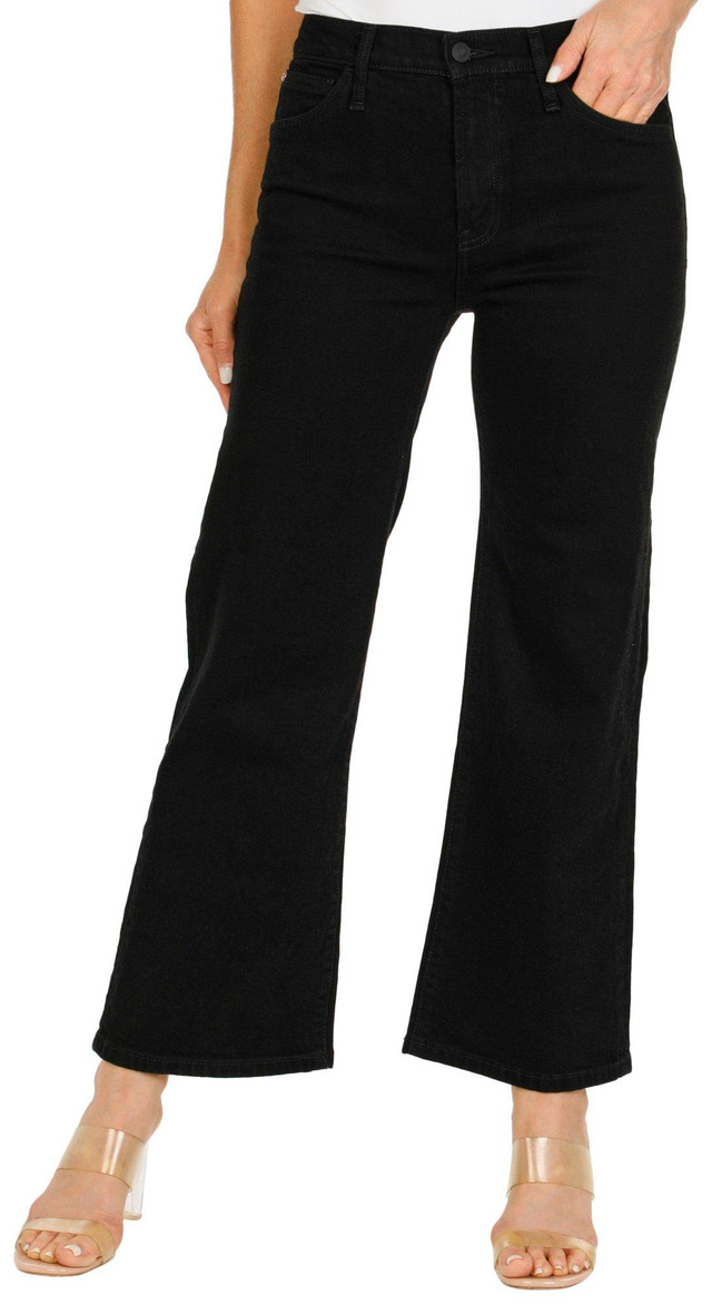 Introducing our Women's Rosalie High-Rise Wide Leg Ankle Jeans, crafted from a blend of cotton and elastane for a comfortable and flexible fit. These jeans feature a stylish solid color, a classic button zip fly closure, and a 5-pocket cut for added functionality. Designed with a high-rise waist and wide leg ankle fit, they offer a flattering and modern silhouette.
