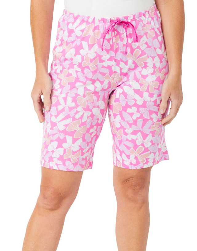 Add a playful touch to your lounge look with the Womens Raining Bows Pajama Shorts. Featuring a cute allover bow print, a comfy drawstring waistband, 10 inch inseam, and a relaxed Bermuda length, these shorts are perfect for cozy nights and laid-back mornings. Fabrication 60% cotton, 40% rayon
