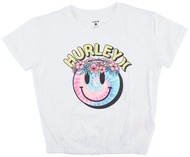 Hurley designs comfortable clothing with the ocean lover in mind. This tee features a solid color design on lightweight fabric, chest Screen print, a round neckline, and a cropped styling with elastic hem. Fabrication is cotton and polyester blend.