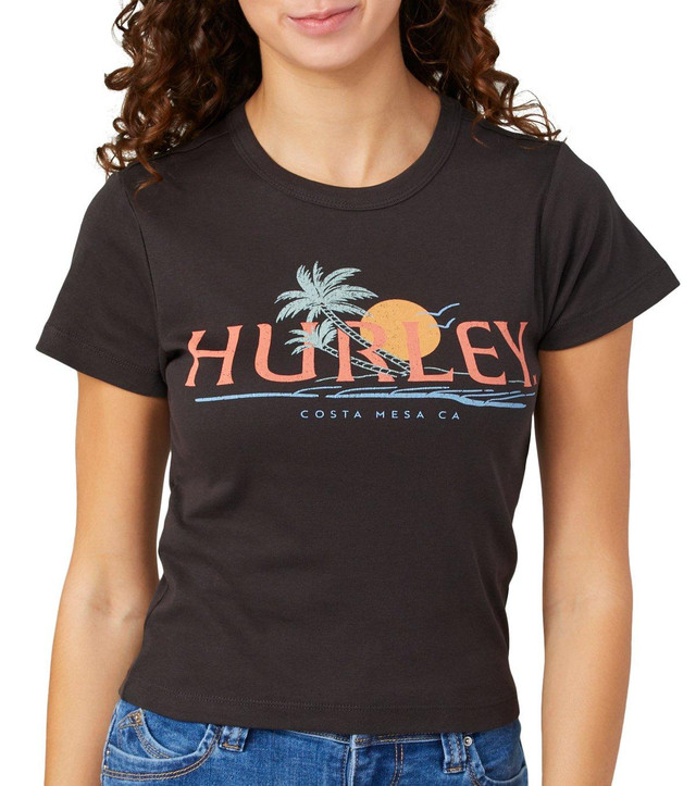 This juniors baby tee features a coastal inspired graphic with brand script, a classic crew neckline, short sleeves, and a cropped length. Its laid back style makes it perfect for sunny days and casual outfits.