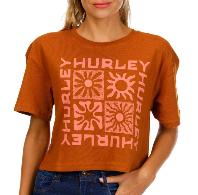 Showcase bold floral style with the Juniors Crew Neck Botany Crop Tee T-shirt in a solid brown color featuring a front branded graphic with stylized flower imagery. Designed with a cropped length, crew neckline, and short sleeves for a modern silhouette. Fabrication is 100% cotton. Length measures approximately 18 in.