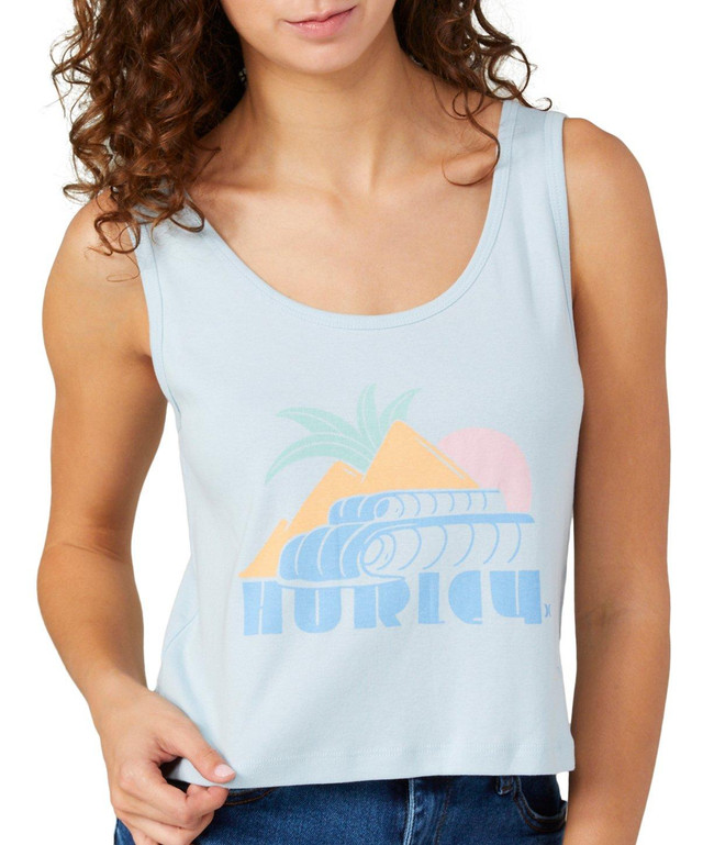 This juniors tank top features a bold logo graphic with a Palm Peaks theme, a scoop neckline, and a cropped length. The sleeveless design makes it a cool and casual choice for sunny days and laid back looks. Fabrication 100% cotton