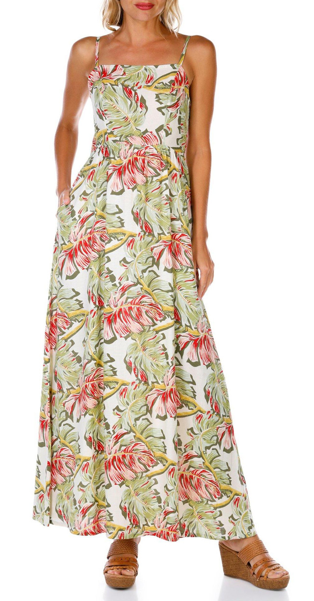 Make a statement in this Hurley maxi dress featuring a bold tropical leaf pattern and a stylish square neckline. The flowing silhouette offers a flattering fit with breezy comfort, ideal for warm weather and laid-back days. Fabrication is 85% viscose 15% flax.