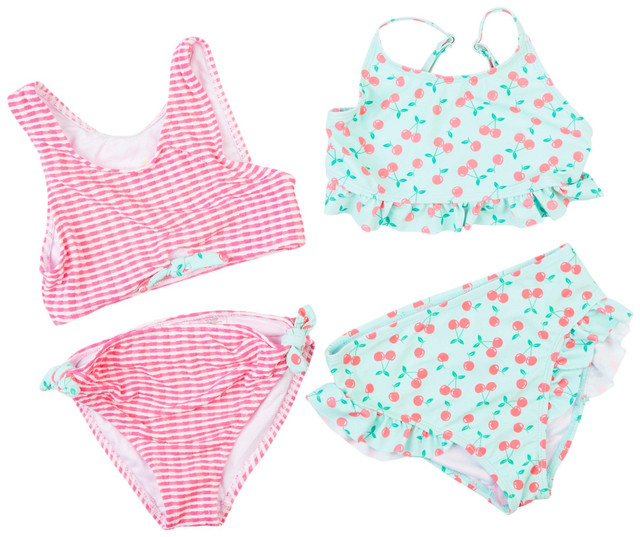 This 4-piece swim set for girls is a playful and practical choice for sunny adventures. Featuring two mix-and-match bathing suits, one with a full cherry pattern and the other with pink stripes accented by cherries, this set offers endless styling options. Made with UPF 50+ protection, it keeps her safe while she splashes in style. A great value for active little ones who love variety and charm.