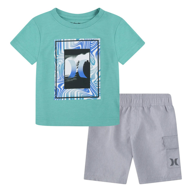 Easily get your little guy dressed in coordinated, laid-back style with this two-piece set from Hurley. The T-shirt features a boxed logo graphic with a tagless crewneck for easy wear and the woven twill shorts have a stretch waistband for a comfy fit.