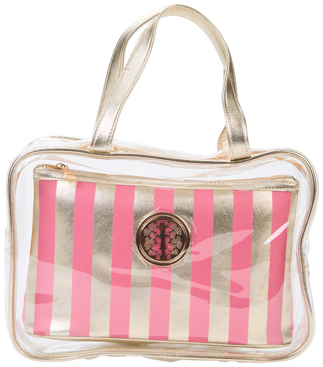 Organize beauty essentials with 2 Piece Striped Silver Pink Clear Cosmetic Bag Set. Includes a large clear bag with silver edges and double handles, plus a smaller silver and pink striped bag, with a gold medallion, that fits inside for added storage. Stylish and practical for travel or everyday use. Ideal as a gift or personal accessory. Measures approximately 12 in x 5 in x 8 in (large bag) and 11 in x 4.5 in x 7 in (small bag).