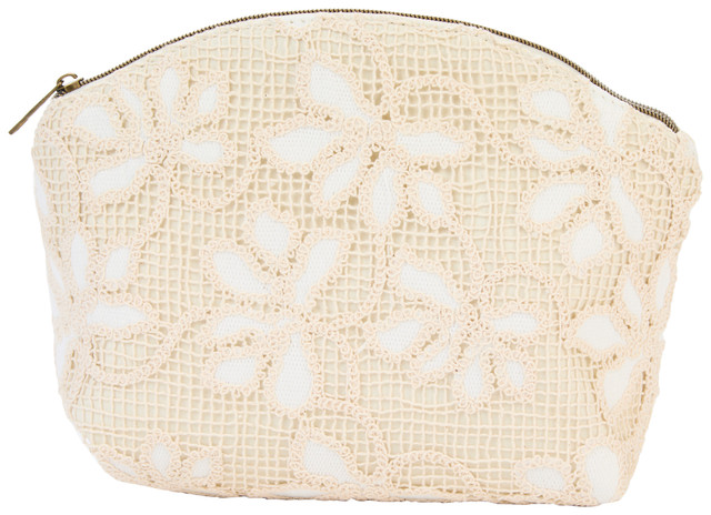 Store and carry beauty essentials with this Floral Crochet Cosmetic Bag. Covered in off white crochet lace with a delicate floral pattern, it features a large main compartment and an inside pocket for organized storage. Compact and elegant, perfect for travel or everyday use. Ideal as a thoughtful gift or stylish personal accessory. Measures approximately 9.5 in x 4 in x 8.5 in.