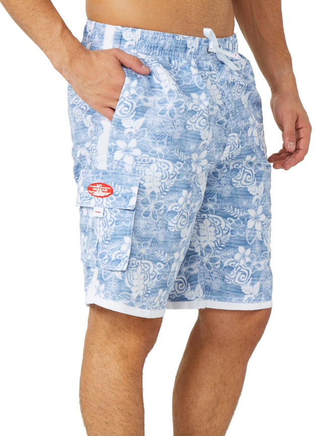 Make a splash with the Men's Tropical Floral Swim Shorts. Featuring a vibrant print, elastic drawstring waistband, side seam and cargo pockets, and a 10-inch inseam, they are perfect for beach days and poolside lounging.