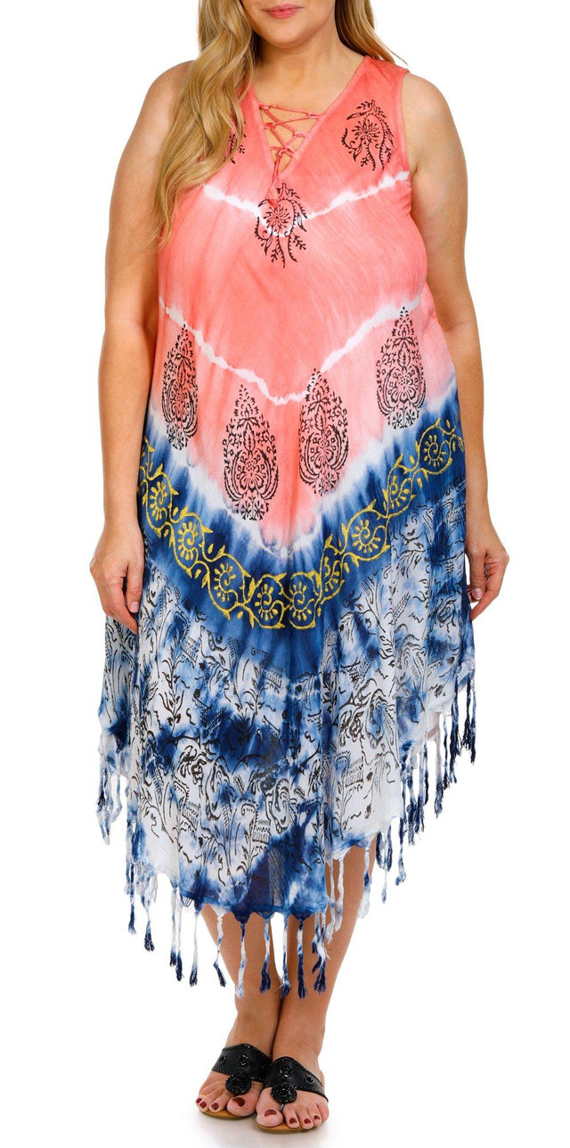 Make a statement with this Sleeveless Lace Up Fringe Coverup Dress. This eye-catching coverup features a vibrant tie-dye print and a stylish lace-up neckline, adding a touch of bohemian flair to your beachwear. The flowing silhouette ensures a comfortable and breezy fit, while the tassel fringe adds a playful and chic detail. Perfect for sunny days by the water, this coverup dress combines style and comfort effortlessly.