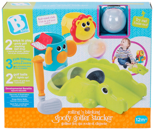 Encourage active play and development with the Baby Rolling Blinking Goofy Golfer Stacker Toy featuring two modes of play: a goofy golf game and stacking ball drop. Includes three fun character friends and two golf balls, one with lights for visual stimulation. Supports gross motor skills, hand eye coordination, and discovery through exploration. Requires 2 button batteries (included). For ages 12 months and up.