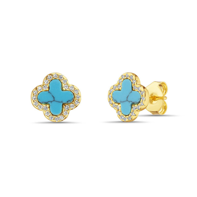 Add a touch of luck and elegance with the 14K Turquoise Clover Stud Earrings. Featuring a classic four-leaf clover silhouette crafted in radiant gold and accented with smooth turquoise stones, these studs offer a fresh pop of charm and sophistication. Their petite size and polished finish make them perfect for everyday wear or layering with other favorites. A graceful nod to good fortune and timeless style.