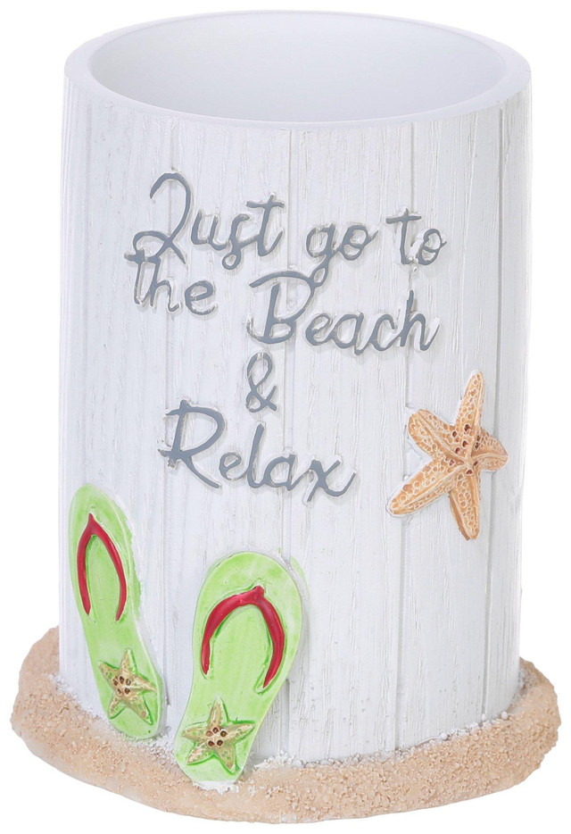 Bring breezy vibes to your bathroom with the Beach Mode Tumbler Cup, featuring flip-flops and a starfish on a wood fence design paired with the quote Just go to the Beach & Relax. Made from durable resin, it adds a touch of coastal charm while serving as a practical piece for drinking or rinsing or for storing toothbrushes. Perfect for beach lovers looking to infuse their space with laid-back style. Measures approximately 4.5 in x 3 in round.
