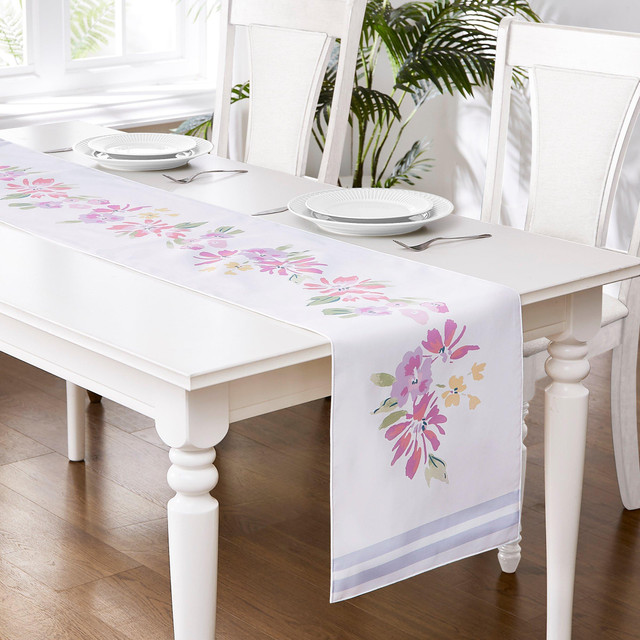 The Izod Catalina 14 in. x 72 in. Runner features a beautiful tropical watercolor floral design in shades of pink, yellow, green and purple. The design spirals up the middle, set off on a white ground bordered on either end with blue and grey stripes. A versatile style perfect for any occasion. Printed on polyester for brilliant color reproduction and easy care.