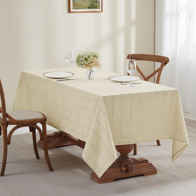 The Izod Chadwick Lurex 60 in. x 84 in. Tablecloth features a textured woven windowpane design with gold or silver lurex added for a bit of sparkle. The windowpane is made up of 3 in. squares bordered with double-woven rows and hem-stitched lines. Made of 55% cotton, 45% polyester for softness, easy care. Machine washable.