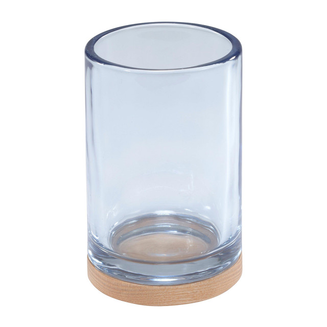 Refresh your bathroom décor with the Izod Cove Blue Glass Decorative Tumbler. It features a nicely weighted blue glass round body with a natural color wood base. It adds an updated look to any bathroom, bedroom or office. Measures 2.76 in. x 2.76 in. x 4.41 in. Other matching pieces available.