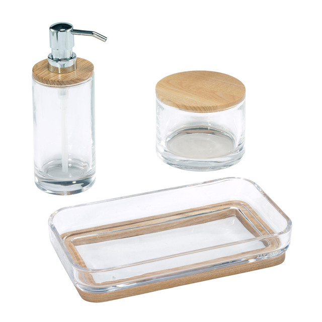 Refresh your bathroom décor with the Izod Cove Clear Glass 3 Pc. Bath Set. It features weighted glass pieces with naturally colored wood tops and bases. The set includes one lotion dispenser (2.76 in. x 2.76 in. x 7.80 in.) one covered jar (4.25 in. x 4.25 in. x 3.46 in.) and one vanity tray (9.25 in. x 5.20 in. x 1.57 in.). Other matching pieces available.