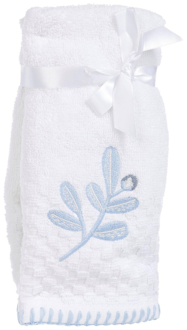 The Izod Kingsley Bath Towel Set features intricately embroidered sky blue mountain laurel leaves on a textured white background, finished with a coordinating blue whipstitched border. Available in a set of 2 bath towels, 27 x 54, or a set of 2 hand towels, 16 x 28, or a set of 2 fingertip towels, 11 x 18. Shop the entire Kingsley Bath Collection.