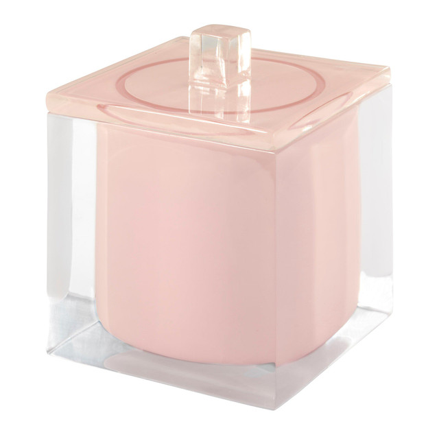 The Izod Marina Pink Covered Jar features a clear resin exterior that shows off the pink interior for a sleek, modern look. The clear top has a pull for easy use. The perfect addition to any bathroom, bedroom or office. Made of durable resin for easy care and long life. Measures 3.41 in. x 3.41 in. x 4.50 in.