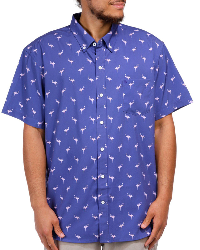 Add a playful touch to your wardrobe with this short sleeve shirt, featuring a buttoned front and a charming flamingo print. The chest pocket adds a practical element, making it perfect for casual outings and relaxed gatherings. Crafted from high-quality materials, this shirt offers both comfort and style. Fabrication is 92% polyester, 8% elastane.